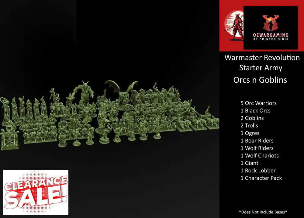 5 Orc Warriors 1 Black Orcs 2 Goblins 2 Trolls 1 Ogres 1 Boar Riders 1 Wolf Riders 1 Wolf Chariots 1 Giant 1 Rock Lobber 1 Character Pack